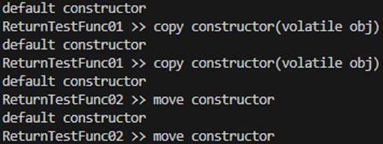 cout<<"ReturnTestFunc02 >> "; return move(returnObj); //copy constructor(volatile obj)